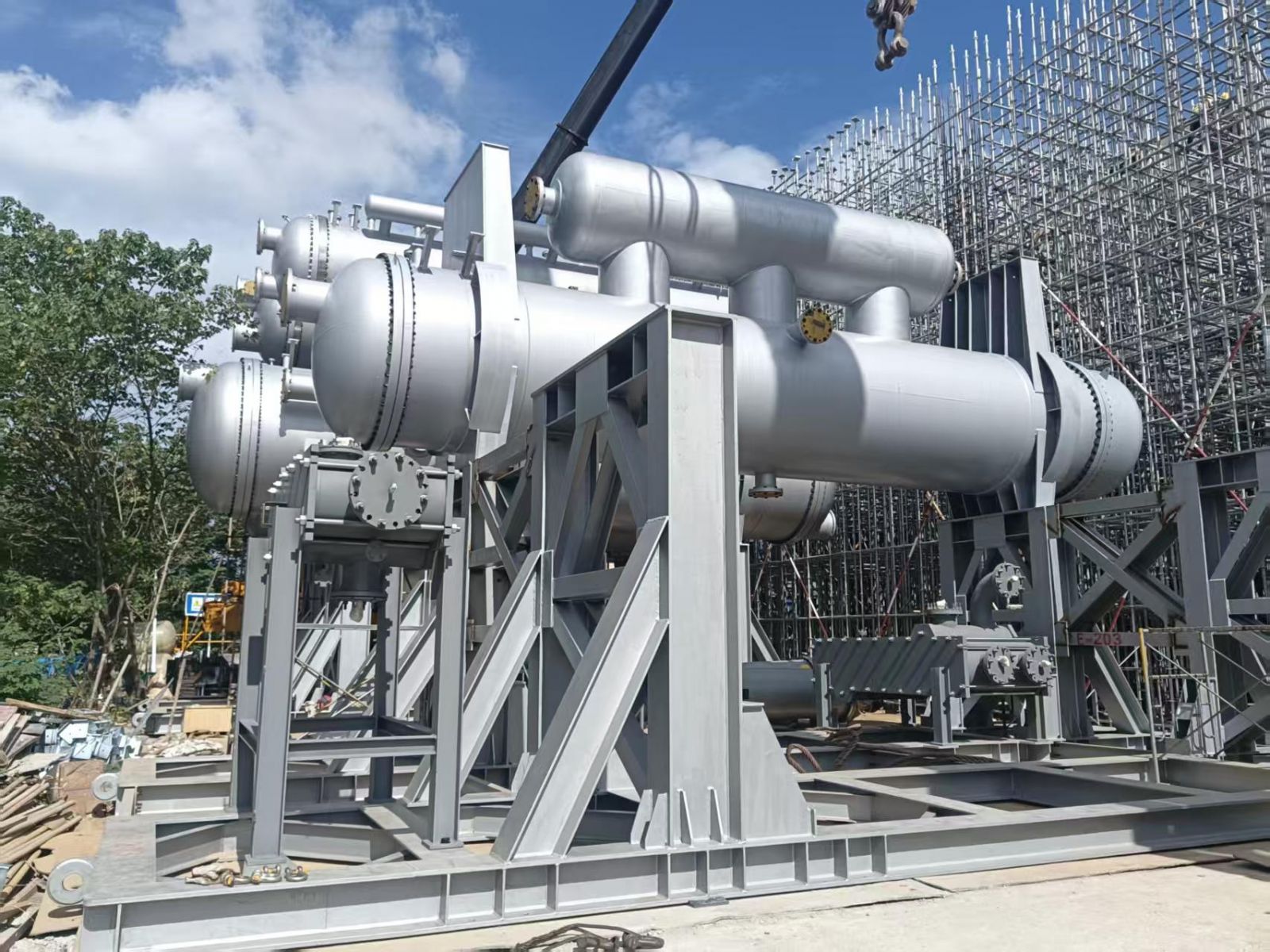 我公司為普泛能源定制的萬千瓦級低品位熱源制冷制冰設(shè)備,現(xiàn)場實現(xiàn)一次吊裝成功。該設(shè)備單套總噸位達500噸,兩套設(shè)備均一次性精準就位。其可廣泛應(yīng)用于乙二醇、合成氨、綠氨、半導(dǎo)體、電廠等多個領(lǐng)域。